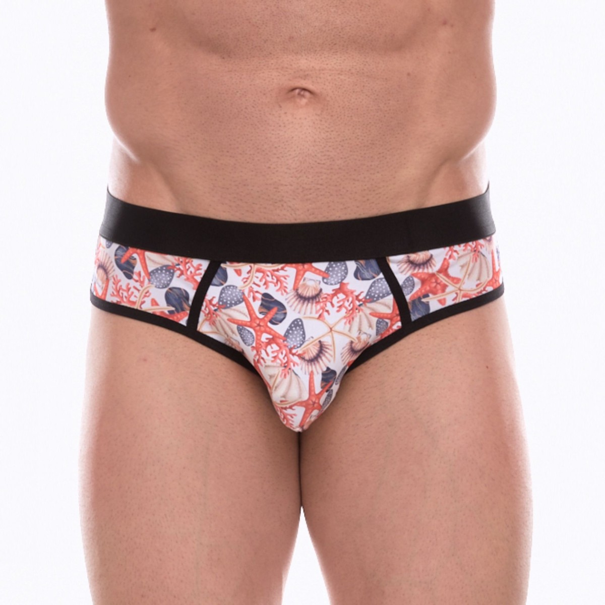 Белые трусы-джоки с принтом в виде цветных ракушек.