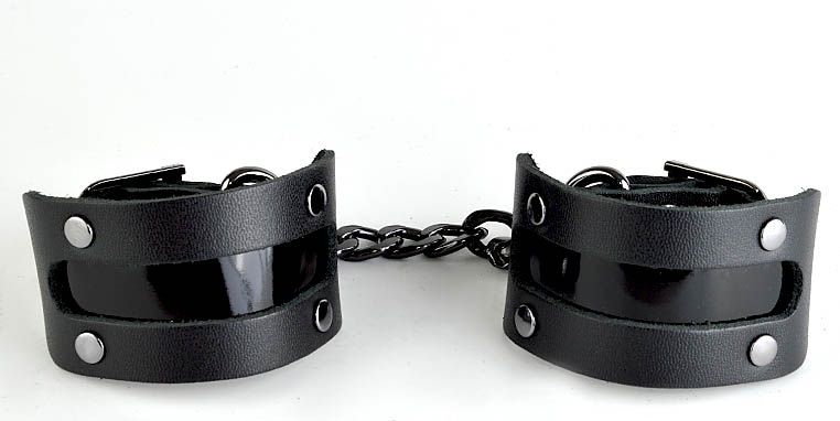Наручники изготовлены из натуральной кожи и декорированы яркой вставкой из лаковой кожи. Общая длина наручников - 25 см. Ширина манжет - 4 см.