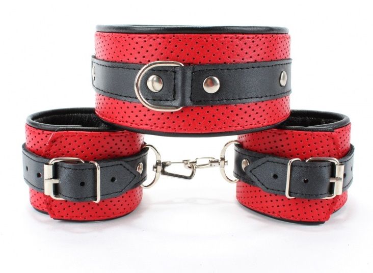 Великолепный бдсм-набор из ошейника и наручников, изготовленных из натуральной кожи. Размер ошейника, браслетов, ленты регулируются при помощи застежек. Длина ошейника - 43 см., ширина - 6 см. Длина оков - 25 см., ширина - 6 см.
