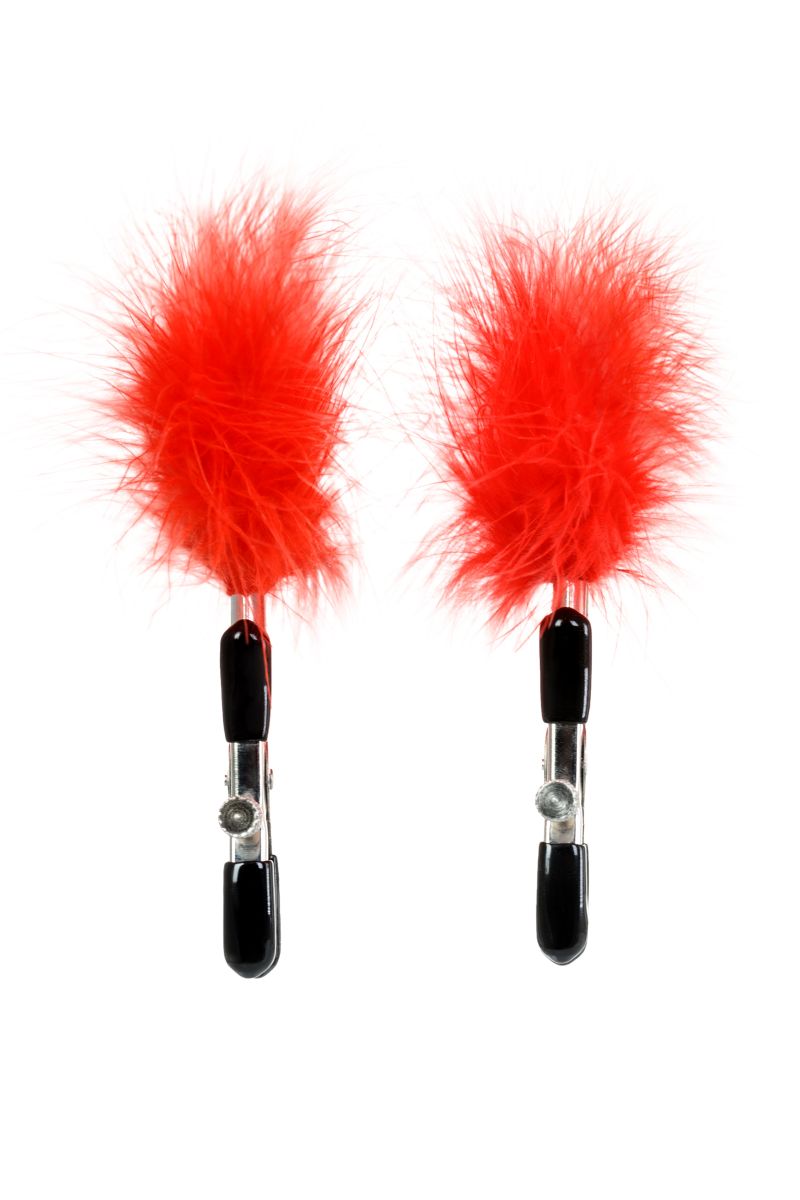 Пожалуй, самые милые из всех зажимов - украшенные перьями. Они стимулируют не только сжатием сосков, но и щекочут грудь. Сдавливание регулируется болтиком и может быть усилено или уменьшено во время интимной игры. Покрытие на концах зажимов защищает нежную кожу.
