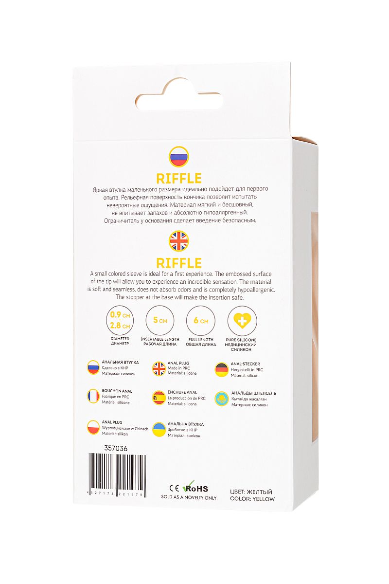 В секс-шопе Orgasmix вы можете купить Желтая анальная втулка Riffle - 6 см. артикул 222894 по цене руб. с доставкой в город Челябинск. Мы осуществляем доставку по всей России. Ближайшая дата отправки этого товара . Заказы принимаются круглосуточно через интернет-магазин.